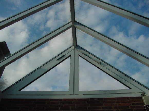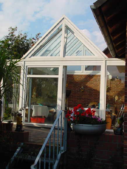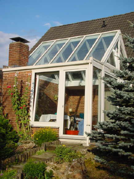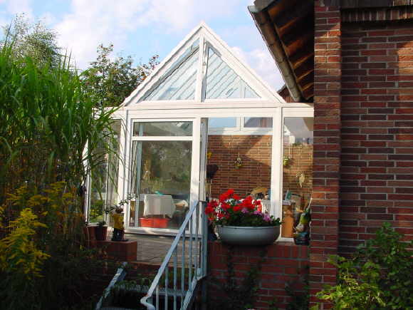 Wintergarten in Kunststoff, 2-seitige Verglasung 1 Seite mit Hebeschiebetür als Durchgang in den Garten